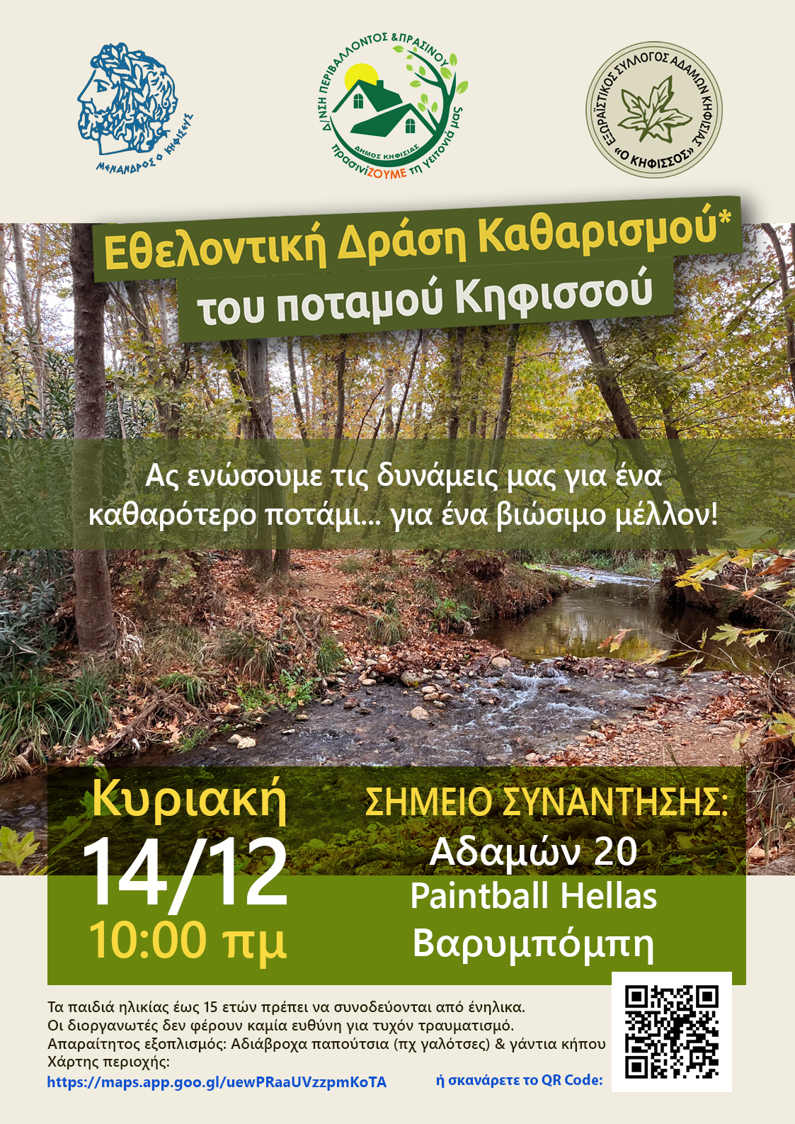 Ο Δήμος Κηφισιάς ενημερώνει ότι την Κυριακή 14/12/2025 θα πραγματοποιηθεί ακόμη μία δράση εθελοντικού καθαρισμού του ποταμού Κηφισσού.
